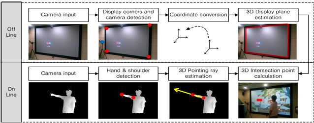 오프라인 단계에서 디스플레이와 카메라 간의 위치 관계를 보정하고, 온라인 단계에서는 사용자의 포인팅 제스처를 인식하여 디스플레이와의 상호작용을 가능. 이 과정을 통해 사용자와 대형 디스플레이 간의 자연스러운 인터페이스가 구현.