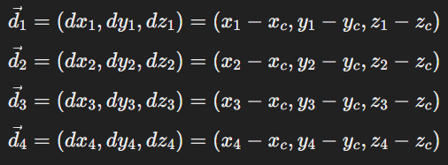dxi,dyi,dzi는 디스플레이의 각 모서리 점에서 카메라 위치까지의 벡터, a, , , 는 디스플레이 평면의 방정식 계수