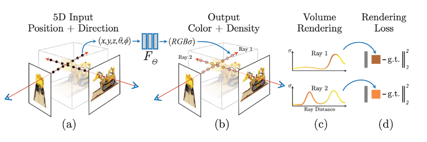 - 5D 정보: 위치 (x,y,z)와 방향 (θ,ϕ)