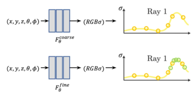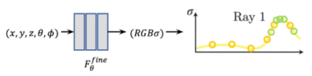 - coarse 단계의 밀도 곡선을 기반으로 밀도가 높은(즉, 물체가 있을 가능성이 높은) 위치에서 추가 샘플링.