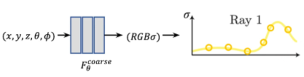 - Coarse Sampling: 광선을 따라 균일하게 샘플링하여 대략적인 밀도(σ)를 계산.
