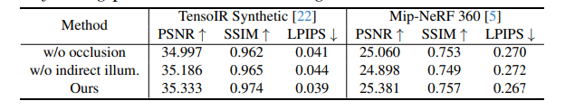 - 차폐 정보가 없을 때와 있는 경우의 성능을 비교한 결과, 차폐와 간접 조명을 포함한 방법이 PSNR, SSIM, LPIPS 지표 모두에서 더 높은 성능을 기록.