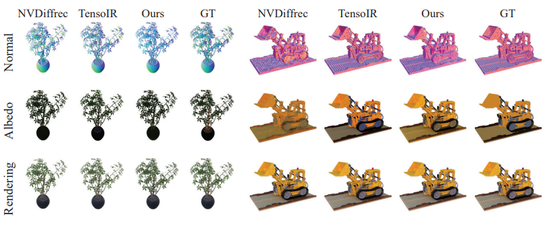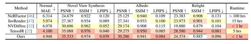 결과에 따르면, 우리의 역렌더링 방법은 새로운 시점 생성(Novel View Synthesis)에 특화된 일부 NeRF 변형 방법들조차 능가합니다.
