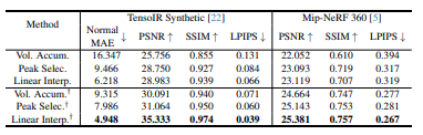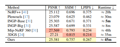 Table 2. Mip-NeRF 360에서의 정량적 비교(Quantitative Comparison):