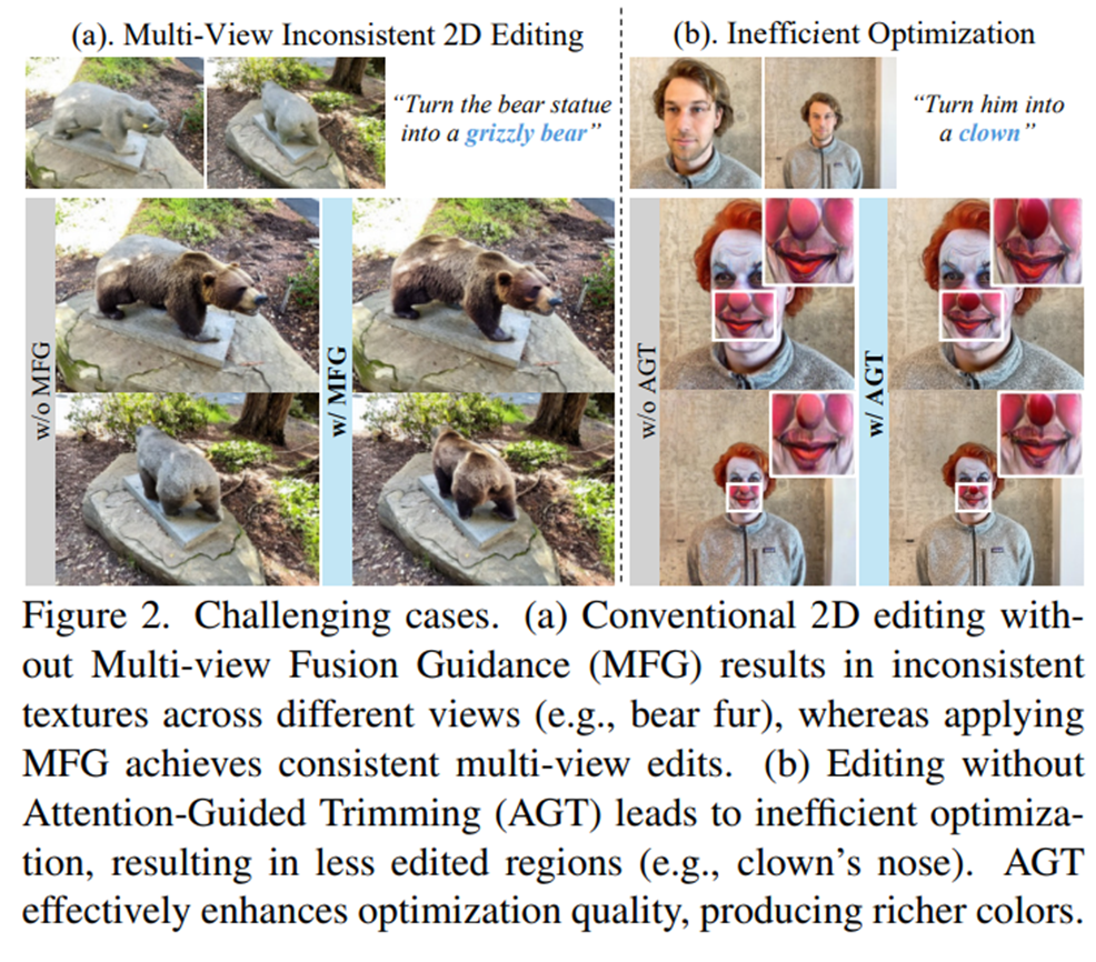 기존 방법들은 여전히 multi-view 불일치를 보이며 noisy gradient가 최적화를 방해하고 Editing 효과가 거의 없거나 블러가 포함된 부적절한 출력(suboptimal outputs)을 생성