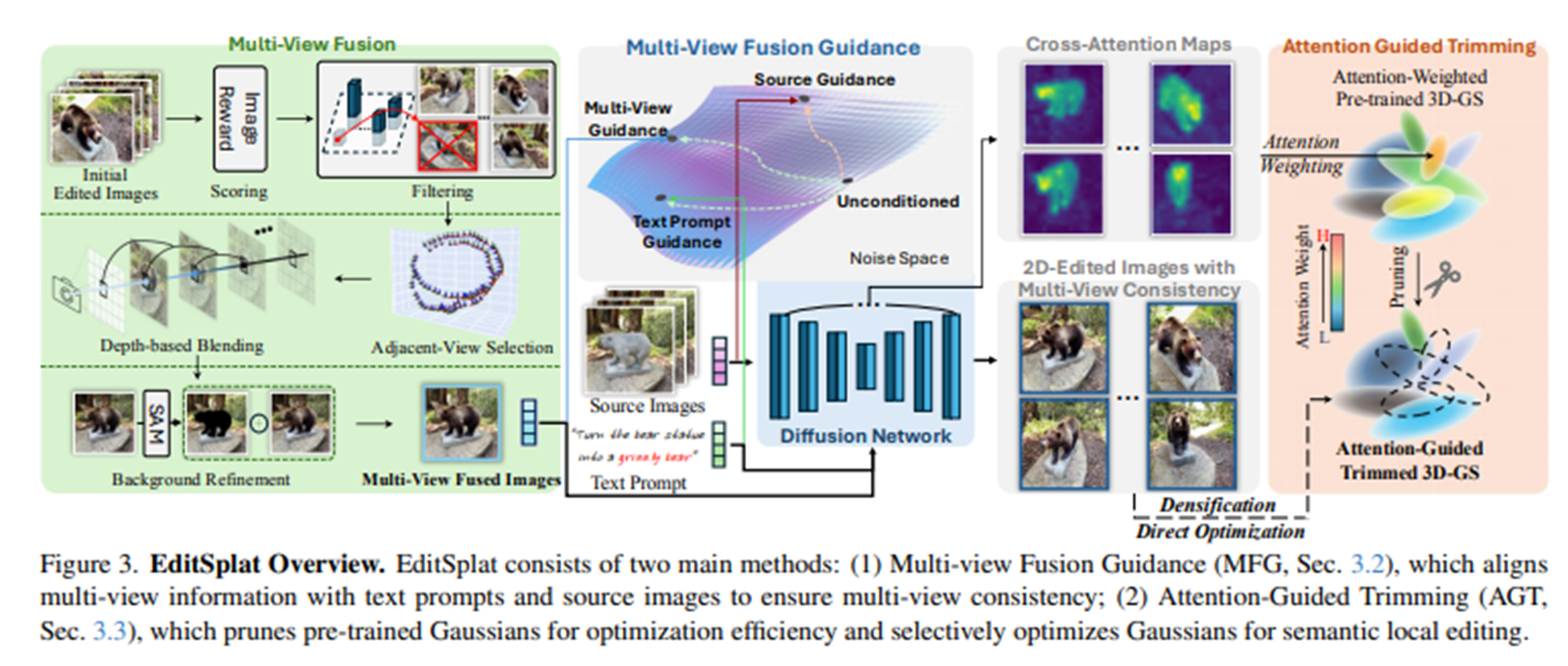 EditSplat은 multi-view 일관성을 위해 Multi-view Fusion Guidance(MFG)를 도입. pre-trained된 3DGS가 가진 비효율성 문제를 pruning 함으로써 해결하고(AGT) densification와 최적화