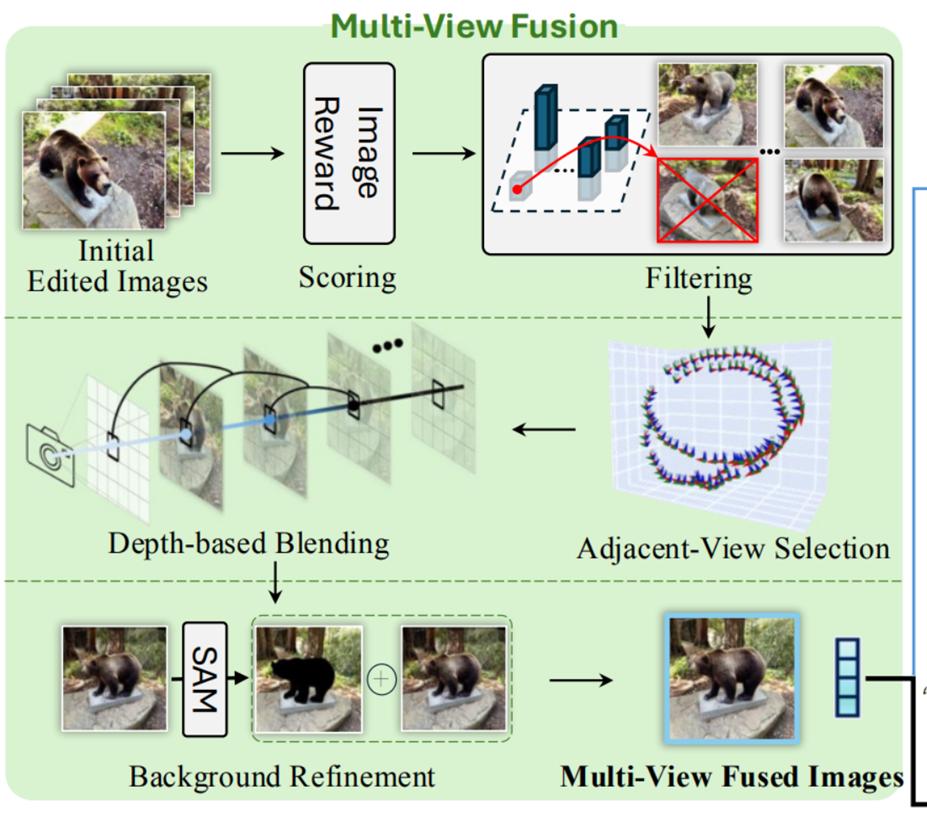 EditSplat은 multi-view에서 동일하게 보이도록 이미지들을 depth map으로 합치고, 텍스트와 원본 정보를 참고해 빠르고 일관되게 3D 장면을 editing.