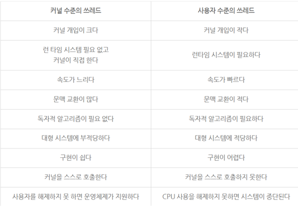 커널 모드로의 전환 없이 스레드 교환이 가능하므로 오버헤드가 줄어든다.